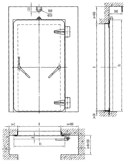 | 型号 | 门孔宽B | 门孔高H | 门扇厚δ | C | B1 | H1 |